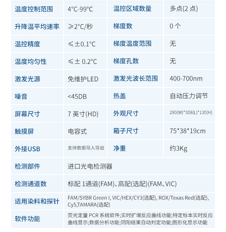 分析算法 | 扩增曲线,标准曲线定量、熔解解曲线,基因分型SNP(选配) |