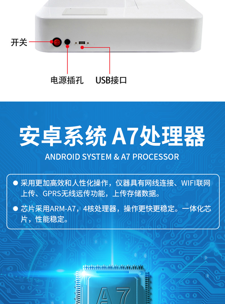 1、安卓智能操作系统,采用更加高效和人性化操作,仪器具有网线连接、wifi联网上传、GPRS无线远传功能,快速上传数据。